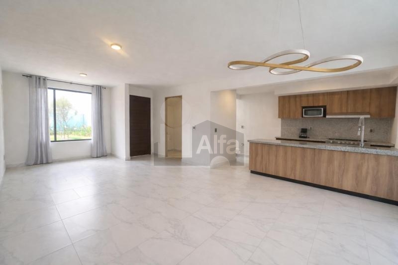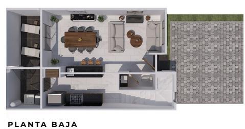 Planta baja: Sala y comedor con buena iluminación natural, cocina integral equipada, cuarto de lavado, patio, medio baño para visitas y estacionamiento para dos autos.